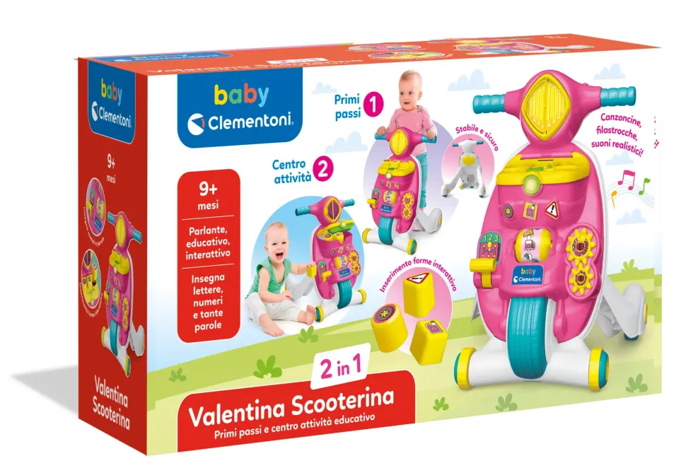 Scooter 2In1: Un Originale Primi Passi, Ma Anche Un Centro Attività Meccanico Ed Elettronico Per Imparare Lettere E Numeri E Tanti Altricontenuti Educativi, Sviluppando Coordinazione E Manualità. Con Una Struttura Resistente E Sicura Il Walker Favorisce Lo Sviluppo Della Motricità, La Coordinazione E La Percezione Dello Spazio, Aiutando I Più Piccoli A Muovere I Primi Passi. Il Pannello Frontale È Ricco Di Attività: Un Inserimento Forme Interattivo, Un Fanalino Luminoso, Pulsante Attività, Paginette, Rulli E Ingranaggi. Il Design Iconico Dello Scooter Baby Clementoni In Una Variante Tutta Pink! Made In Italy
