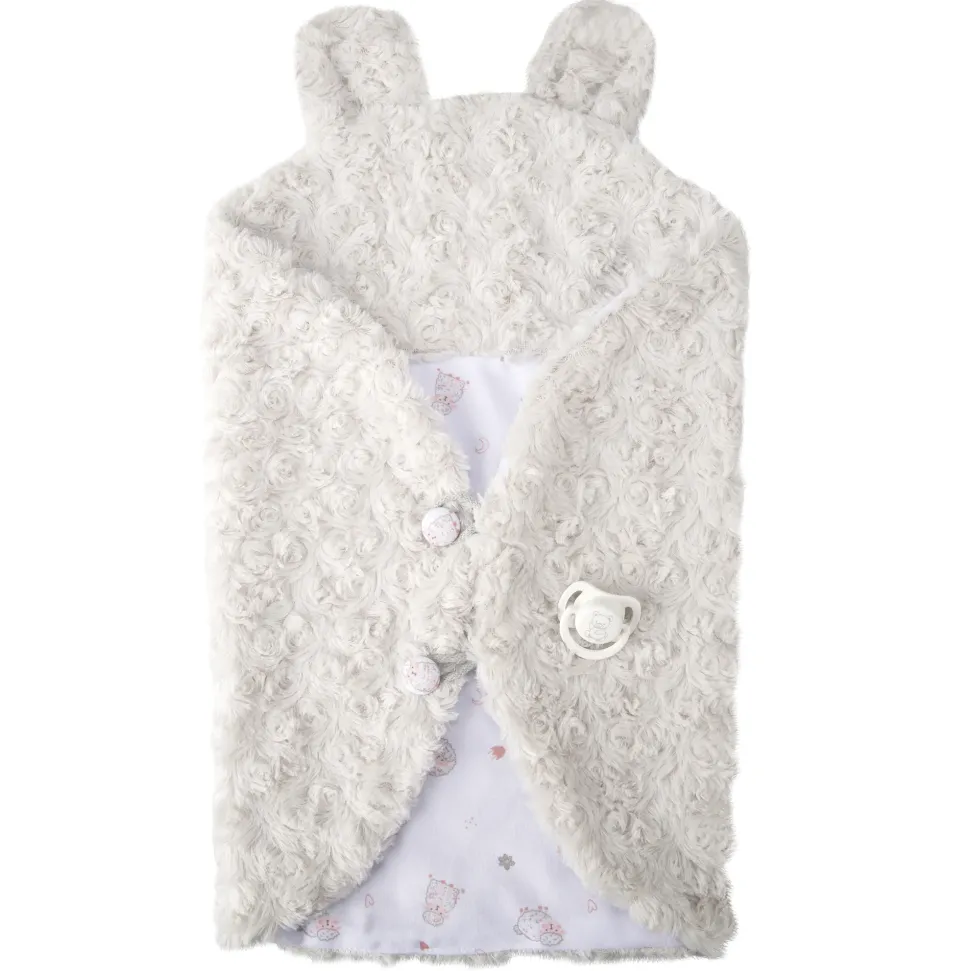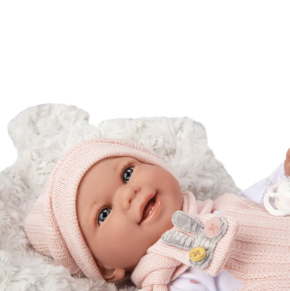 Bellissima Bambola Con Dettagli Dipinti A Mano Epeso Realistico. Indossa Un Elegante Pagliaccetto In Tricot Rosa A Coste, Maglietta A Manica Lunga Bianca Con Stampa, Sciarpina Con Coniglietto In Applicazione E Cappellino Coordinati. Include Una Morbida Copertina In Peluche Grigio Con Lunghe Orecchie E Bottoni Di Chiusura. Ciuccio Incluso.