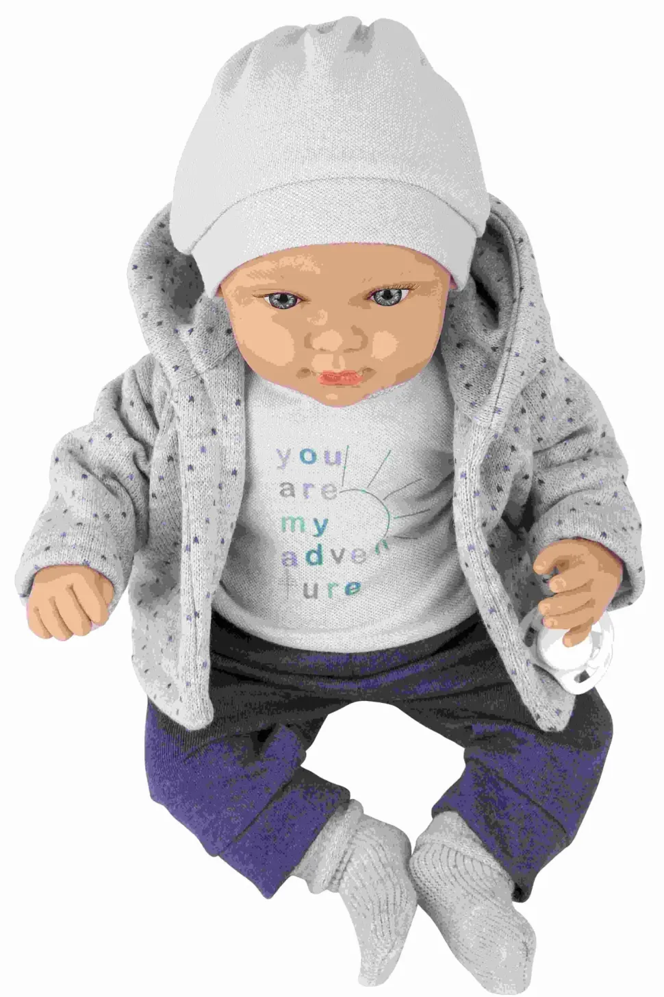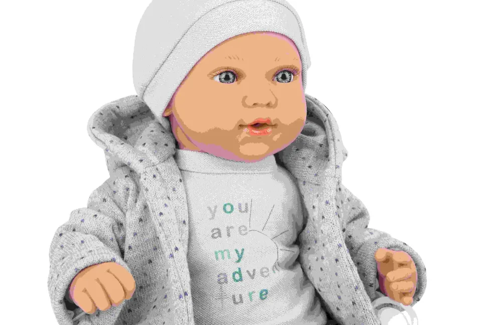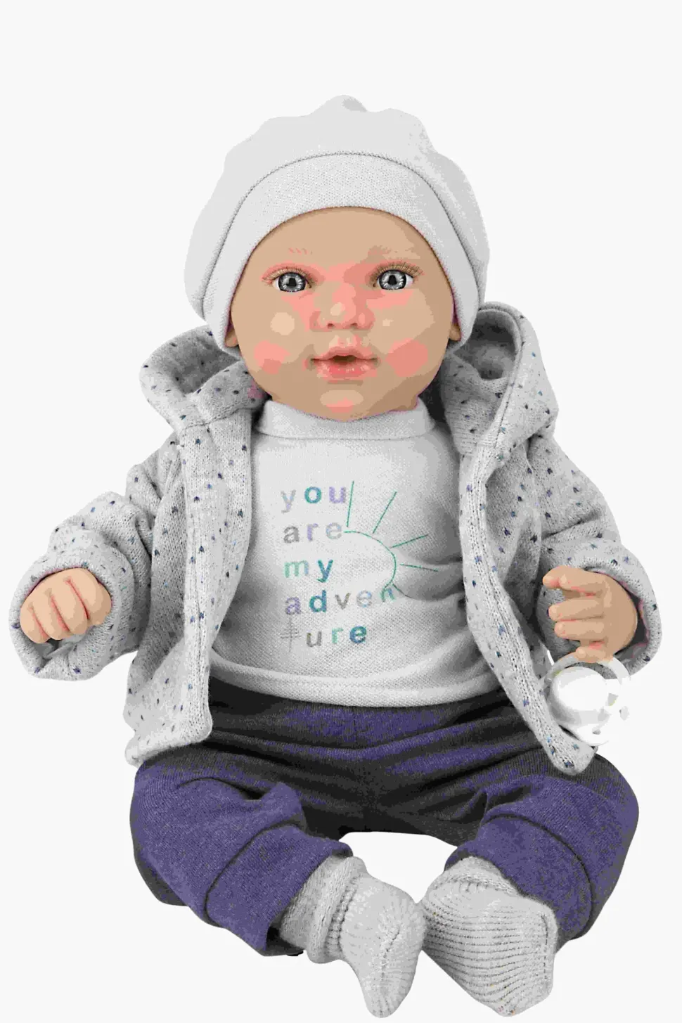 Bellissima Bambola Con Funzione Piangenterealizzata In Morbido Vinile, Con Dettagli Realistici E Delicato Profumo Di Vaniglia. Indossa Un Bel Completino Composto Da Pantalone Jeans, Maglietta Con Stampa Azzurra, Giacchino In Tricot Grigio,Cappellino E Calzine Abbinati. Favorisce Il Gioco Di Imitazione.