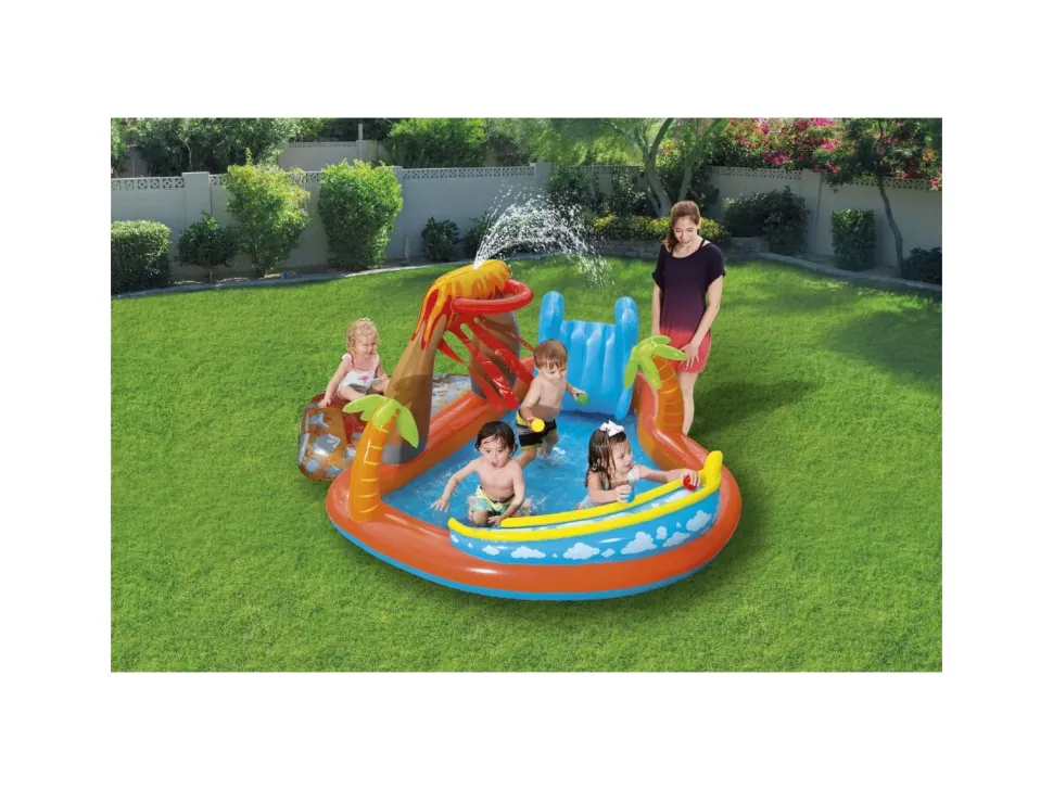 La Piscinetta Gonfiabile Per Bambini A Forma Di Laguna Di Lava Trasporterà I Più Piccoli Con La Fantasia Direttamente Al Centro Di Un Vulcano In Un Divertente Gioco Interattivo. La Sagoma Del Vulcano Gonfiabile Spruzza Acqua Dalla Cima Grazie Al Semplice Collegamento Con La Pompa Dell’Acqua Del Giardino. Lo Scivolo, La Palma, La Finta Lava E La Barchetta Completano L’Avventura In Mezzo All’Acqua. Vinile Testato, Sicurezza Garantita E Materiali Solidi E Resistenti Rendono Questa Piscina Perfetta Per Bambini Dai 2 Anni.