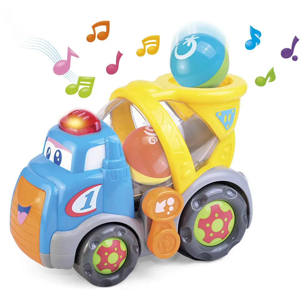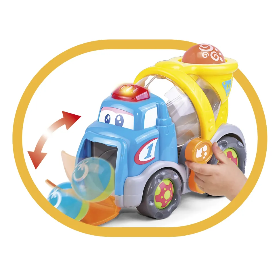 Le Attività In Cantiere Con Questa Simpatica Betoniera Saranno Davvero Divertenti! Questo Veicolo Offre Tante Attività Manuali Per Stimolare Le Abilità Del Bambino: Infilare Le Palline Nel Miscelatore, Miscelare, Abbassare La Leva Per Far Rotolare Fuori Le Palline, Premere Il Pulsante Sulla Cabina Per Attivare Effetti Sonori. Contiene Due Palline. Luci E Suoni.