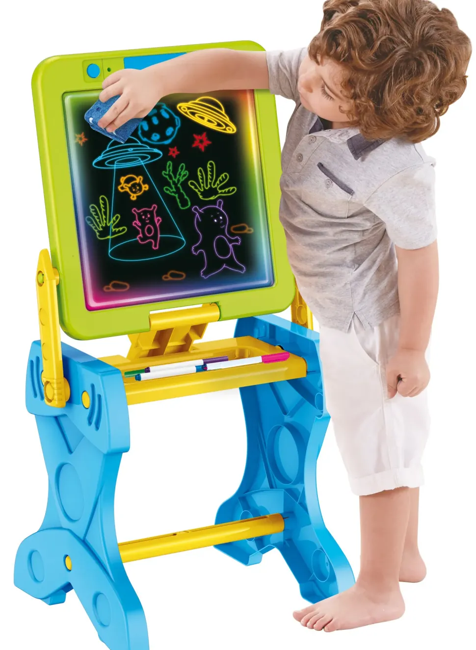 Un Esclusivo Banchetto Con Sgabello Per I Più Piccoli Che Si Trasforma In Una Speciale Lavagna Led Da Terra, Per Effetti Davvero Speciali! Con 20 Giochi Educativi E Il Kit Con 4 Pennarelli Fluo E Cancellino. Impara Tante Cose E Accendi I Tuoi Disegni! .