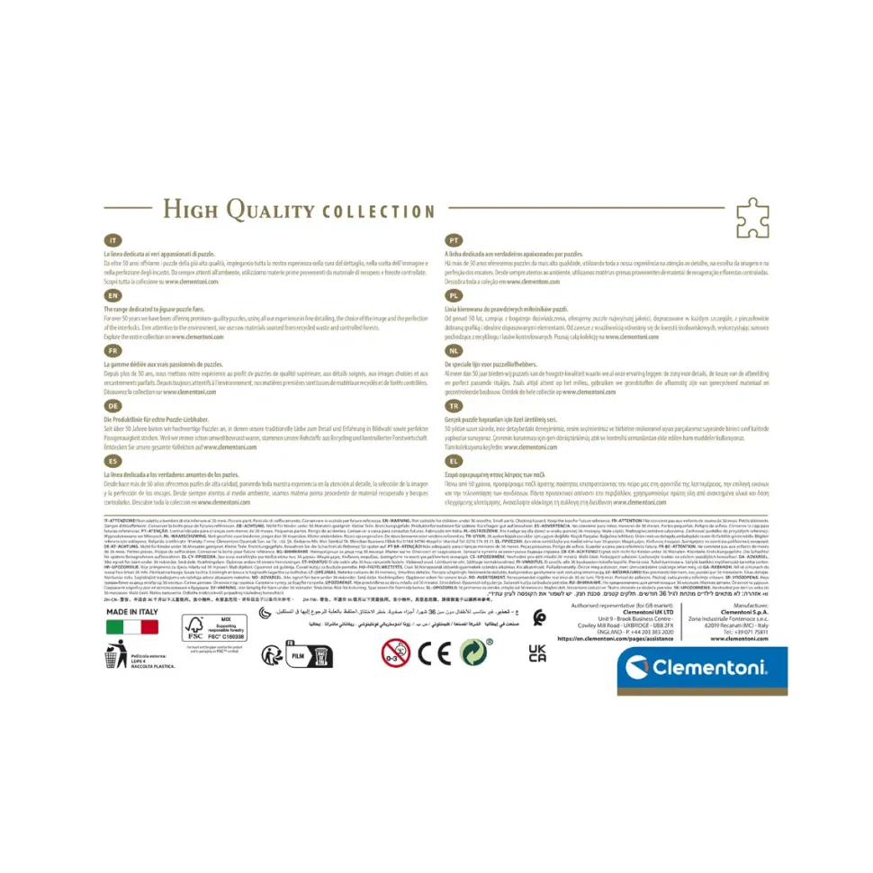 Puzzle Adulti 500 Pezzi Dimensione Puzzle Completo: 49 X 36 Cm Le Immagini Più Suggestive, La Più Grande Varietà Di Pezzatura E La Qualità Firmata Clementoni Per Una Linea Che È Un Riferimento Per Tutti Gli Appassionati Di Puzzle Da Sempre Sensibile Al Problema Dell’Ecologia, La Clementoni Fa Un Largo Uso Di Materiali Riciclati, Evitando L’Impiego Di Componenti Inquinanti. Made In Italy. Visita La Sezione Assistenza Clementoni Per Usufruire Del Servizio “Pezzi Smarriti”