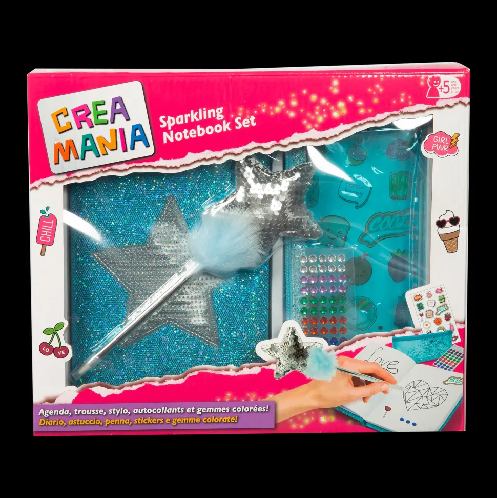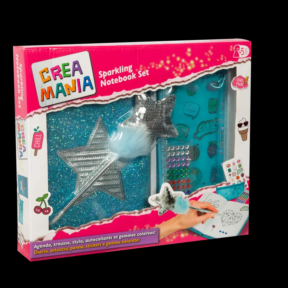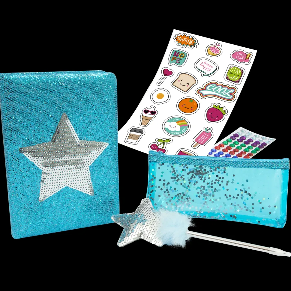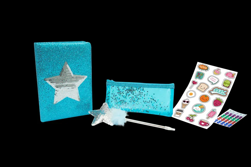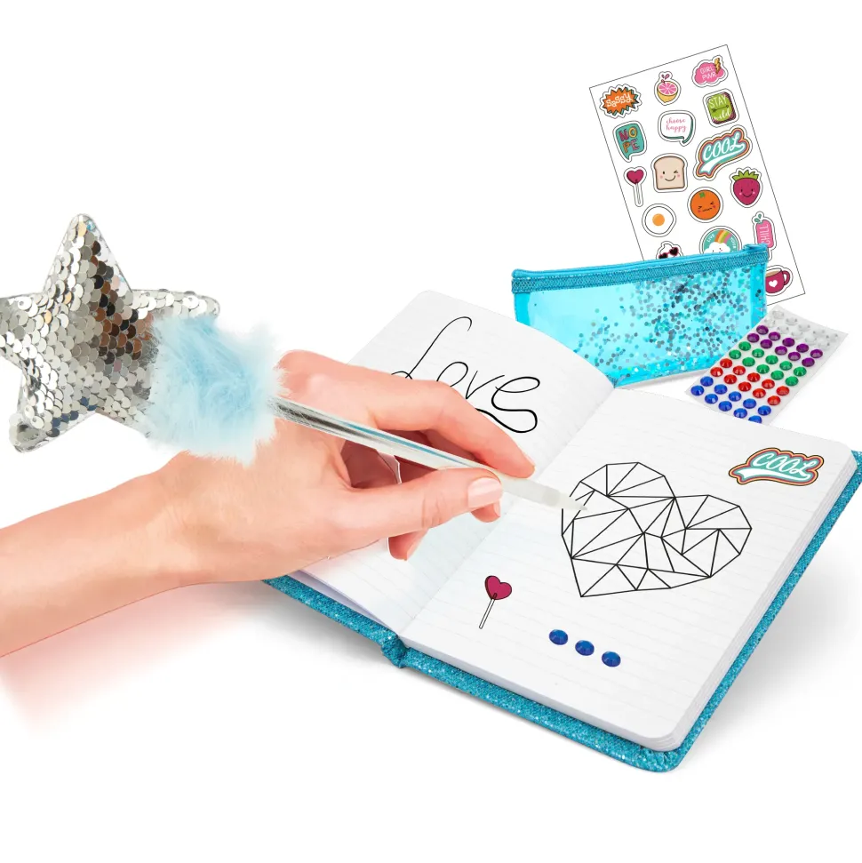 – Set Completo Di Diario Con Copertina, Penna Con Topper A Stella Coordinata, Bustina Con Glitter Coordinata, Stickers E Gemme Adesive Per Decorare Le Pagine Del Notebook.