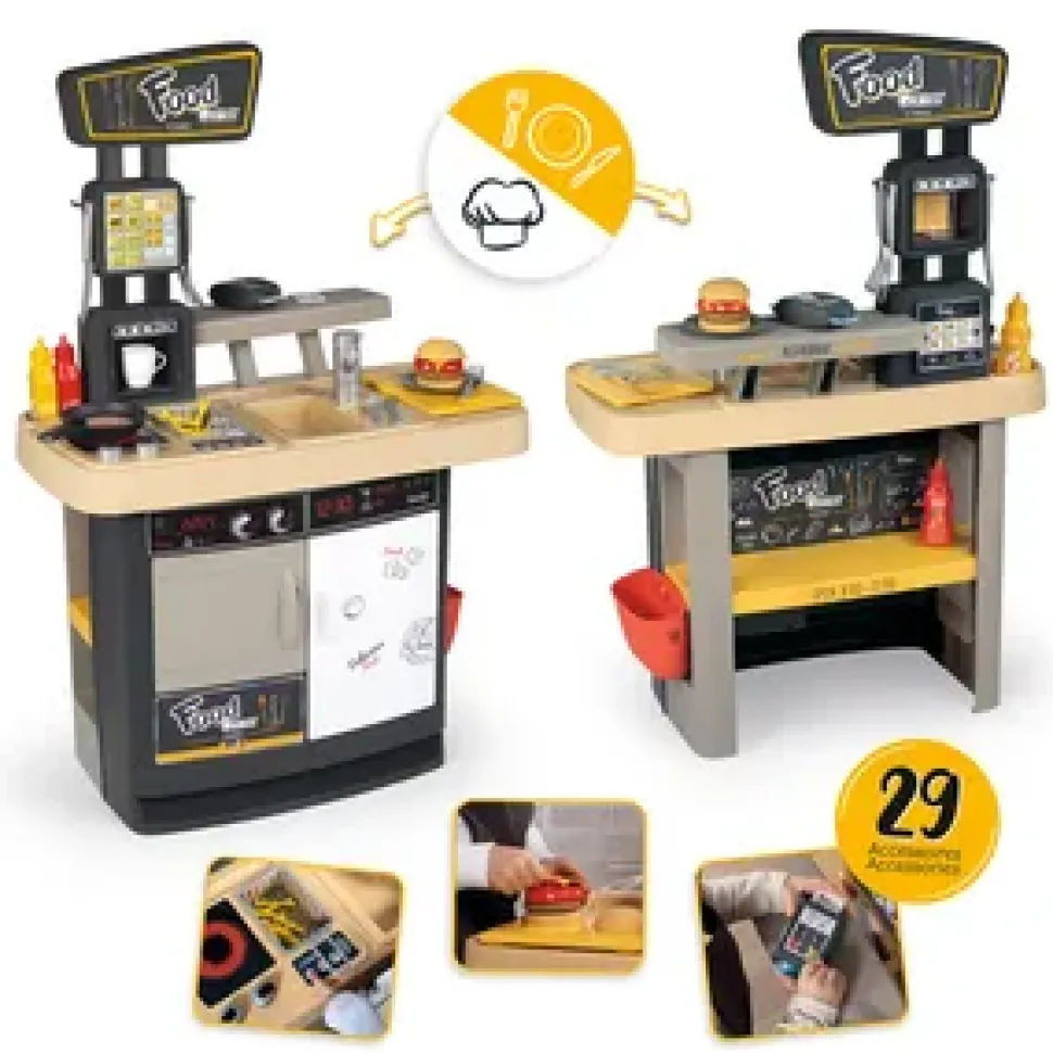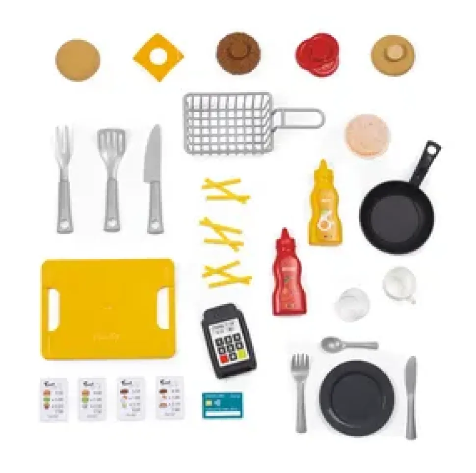 Ristorante Compatto Che Offre Possibilità Di Gioco A 360 Gradi. Si Compone Di 2 Ampie Aree Gioco Separate. L’Area Clienti Comprende Il Menu, Il Terminale Per Gli Ordini, Un Distributore Di Bevande E Il Banco Per Ritirare L’Ordine. La Zona Cucina Per La Preparazione Degli Ordini Dispone Di 1 Piastra, 1 Friggitrice, Macchina Del Caffè, Forno, Frigorifero, Lavello, Registratore Di Cassa… Sono Inclusi 29 Accessori Tra Cui 1 Padella, 1 Piatto, 1 Hamburger, Patatine Fritte, 1 Terminale Di Pagamento, 1 Tazza, 1 Bicchiere, 1 Vassoio, Ketchup, Maionese E Utensili Per Il Barbecue, 1 Pancake, 1 Cesto Di Patatine Fritte E Posate.