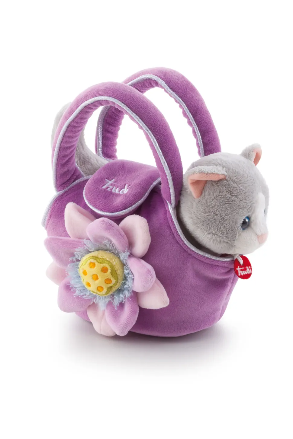 Un Adorabile Gattino È Saltato Nella Borsetta Per Essere Portato A Spasso E Coccolato In Una Deliziosa Borsetta Viola Che Può Essere Chiusa Con Una Pratica Calamita. Sul Fronte Della Borsetta Vi È Un Enorme Fiore, Nelle Tonalità Del Rosa Con Un Cuore Giallo, Che La Impreziosisce Definendola.Il Peluche E La Borsetta Sono Lavabili In Lavatrice A 30°, Quando La Misura Lo Consente, In Alternativa Possono Essere Lavati A Mano, Utilizzando Una Spugna E Sapone Neutro.