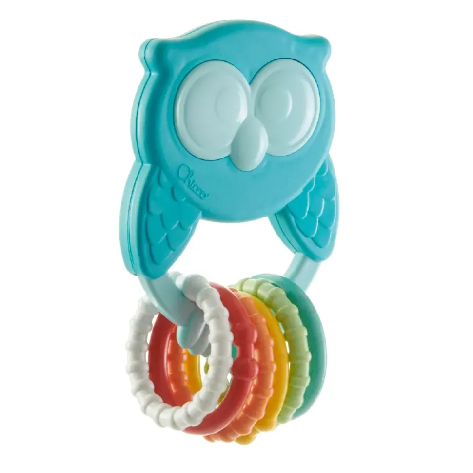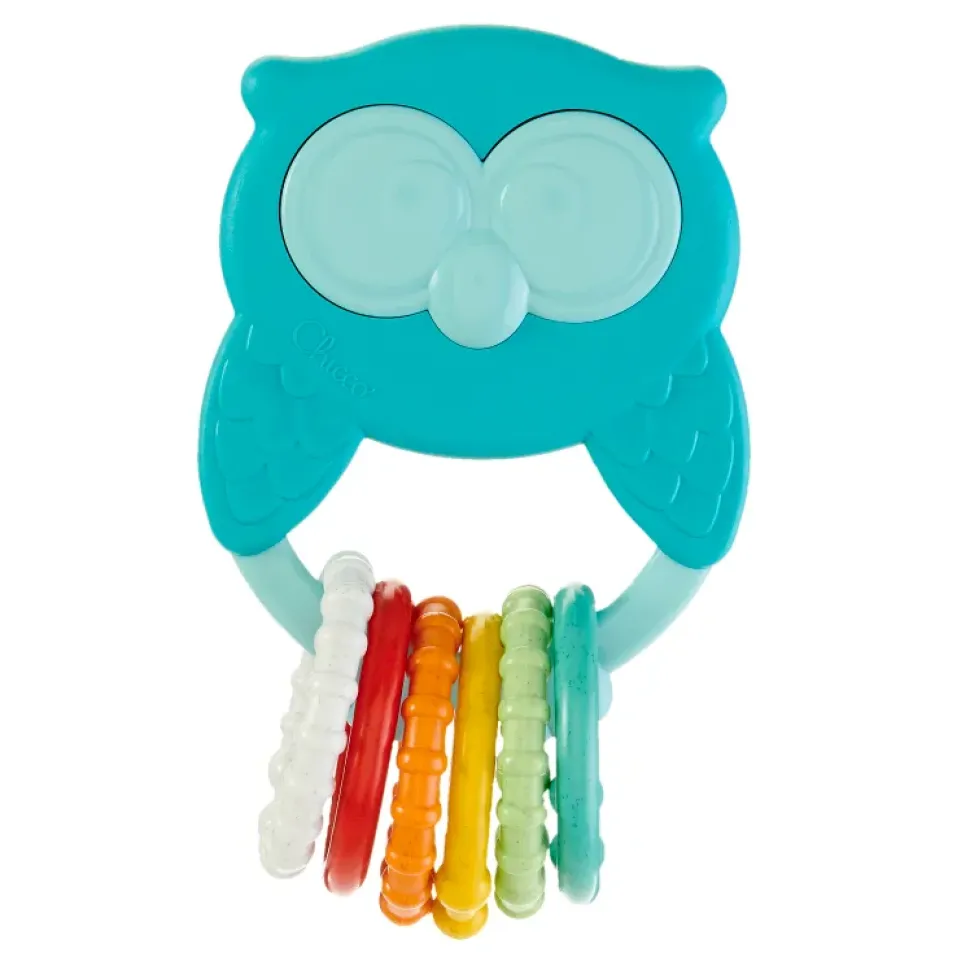 Simpatico Trillino A Forma Di Gufo Realizzato In Plastica Morbida Per Lenire Le Gengive E Dare Sollievo Durante Il Periodo Della Dentizione, Con Un Divertenete Effetto Sonaglio. I Diversi Colori E Le Differenti Texture Degli Anelli Stimolano Inoltre Le Capacità Visive E Tattili Del Bambino.