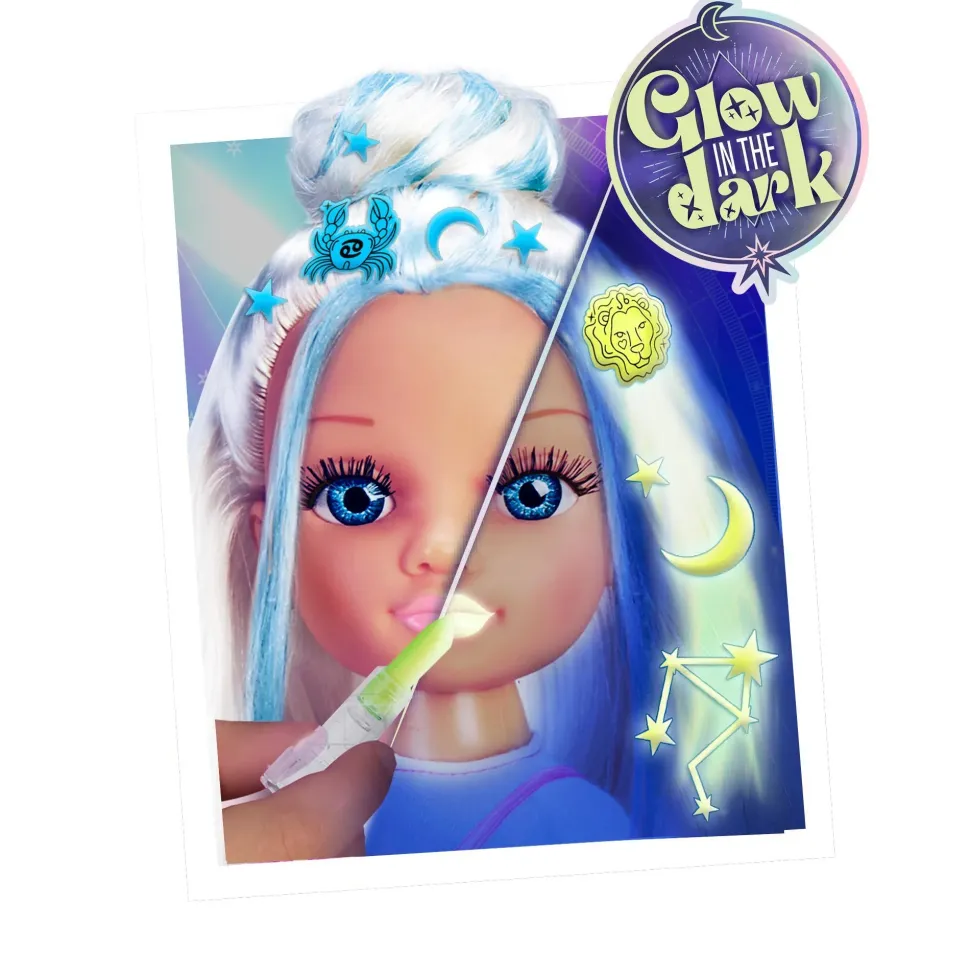 Bambola Nancy Con Lunghi Capelli Con Meches Blu. Indossa Un Abito Rosa Con Stampe Che Brillano Al Buio E Dorate E Una T-Shirt Bianca. Include Adesivi Per Capelli, Glitter, Pettine, Elastici Per Realizzare Acconciature Magiche