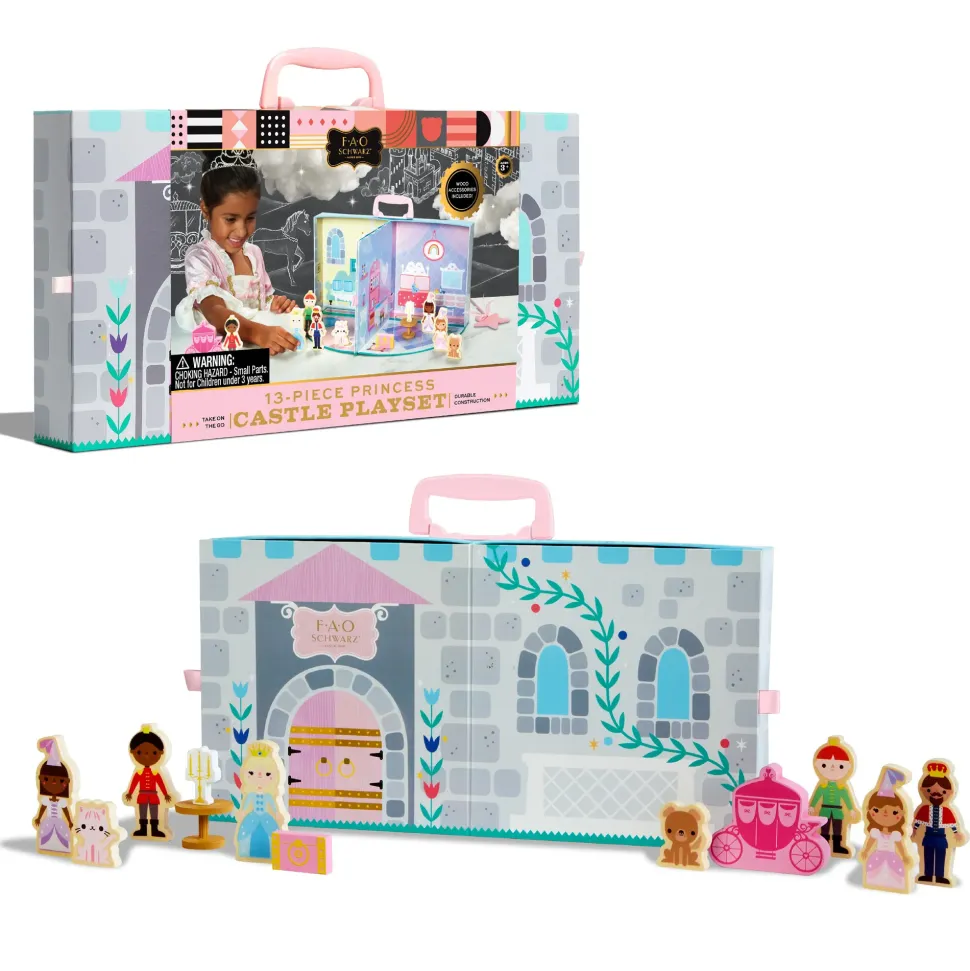 Playset Princess Fao Schwarz Include Scenari, Personaggi Di Legno E Custodia Per Il Trasporto. La Custodia Da Trasporto Si Apre E Diventa Un Castello Fatto Di Legno Per Poter Giocare Con La Fantasia. Il Castello Presenta Divertenti Dettagli Illustrati.