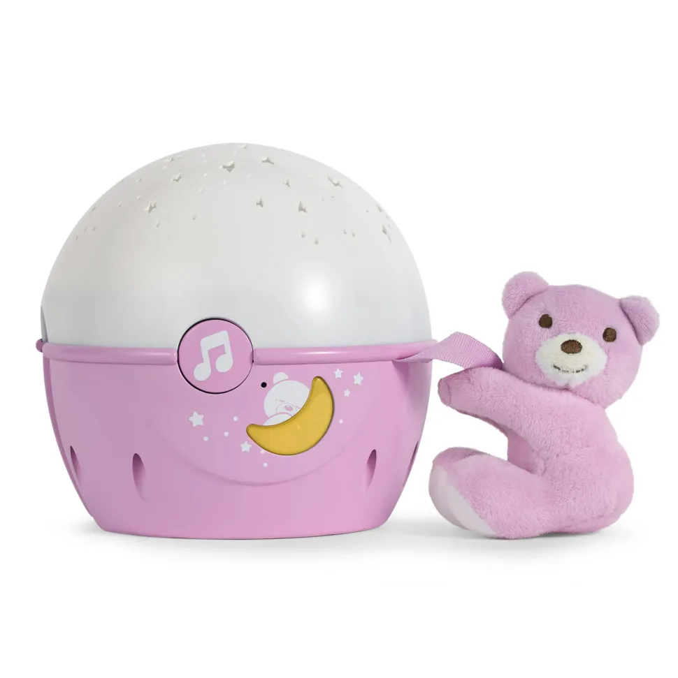 Innovativo Pannello Proiettore Con Uno Speciale Sistema Di Aggancio, Pratico E Sicuro, Per Lettini Da Campeggio E Culle Chicco. Proiezione Con Cambio Automatico Del Colore. 3 Diversi Effetti Luminosi: Proiezione Notturna, Proiezione Soft E Luce Anti Buio. Sensore Sonoro: Attiva Luci E Musica Se Il Bambino Piange, Per Rassicurarlo E Aiutarlo A Riaddormentarsi. Regolatore Di Volume. 30 Minuti Di Musica E Proiezioni. Pupazzo Soffice Rimovibile E Lavabile In Lavatrice. Disponibile In Rosa E Azzurro. Aggancio Adatto A Lettini Con Tubolare Fino A 38Mm, Può Essere Anche Appoggiato Sul Comodino O Sulla Cassettiera.