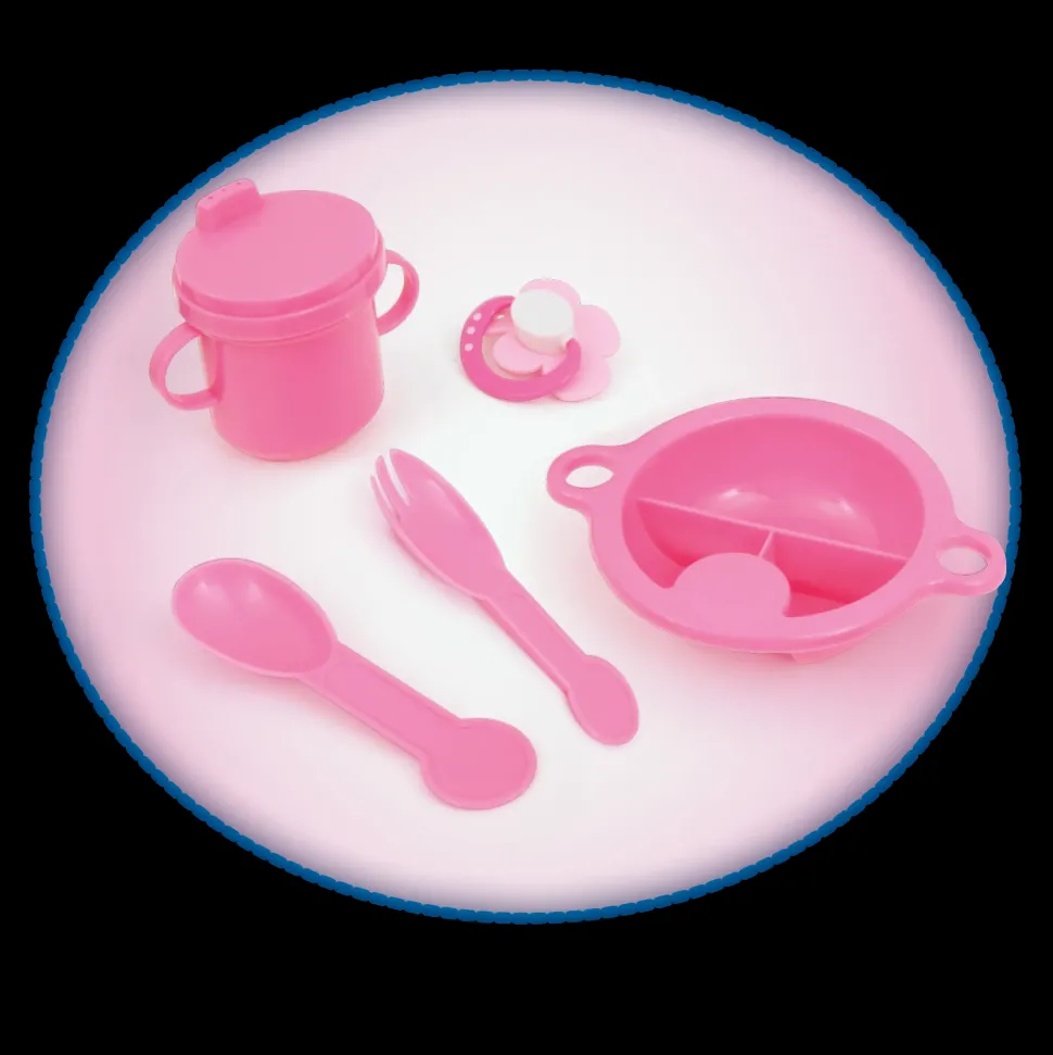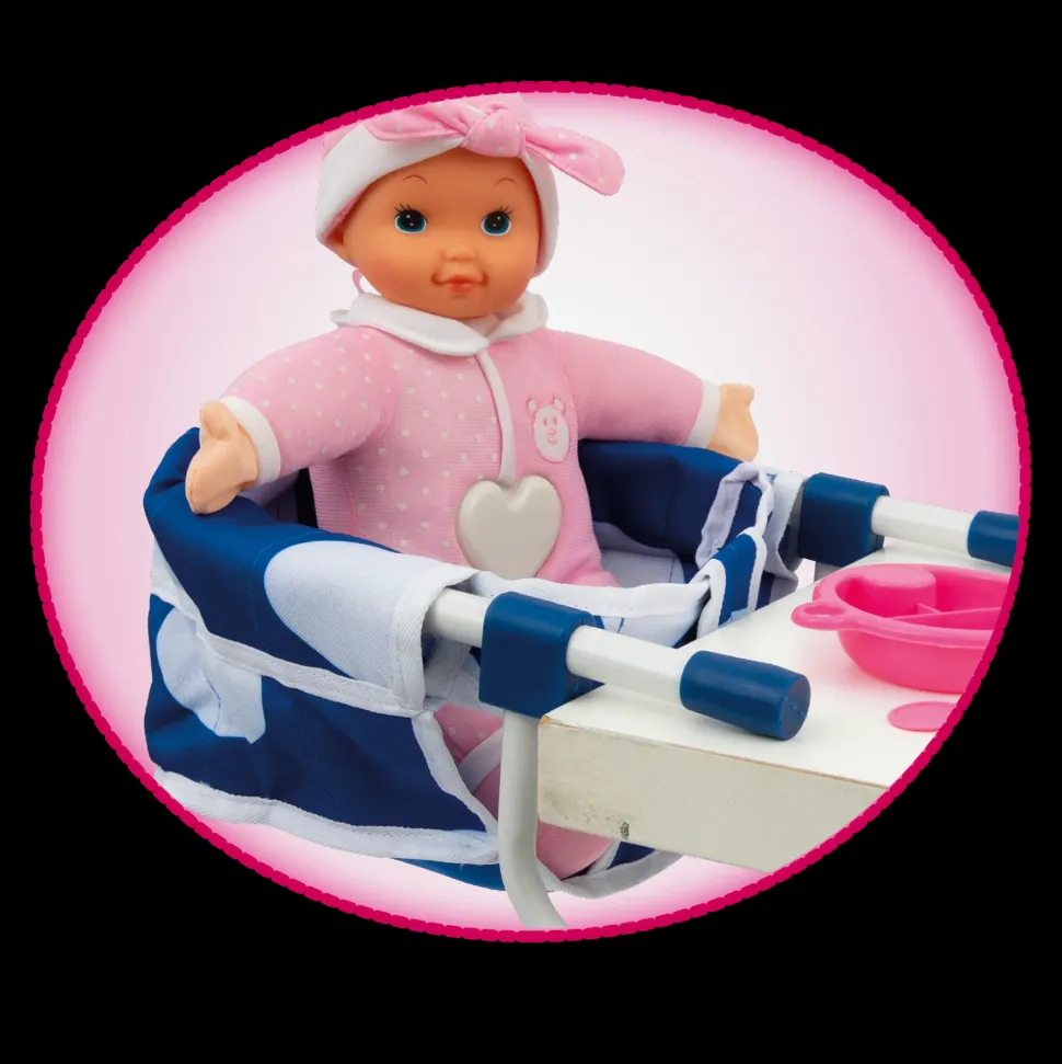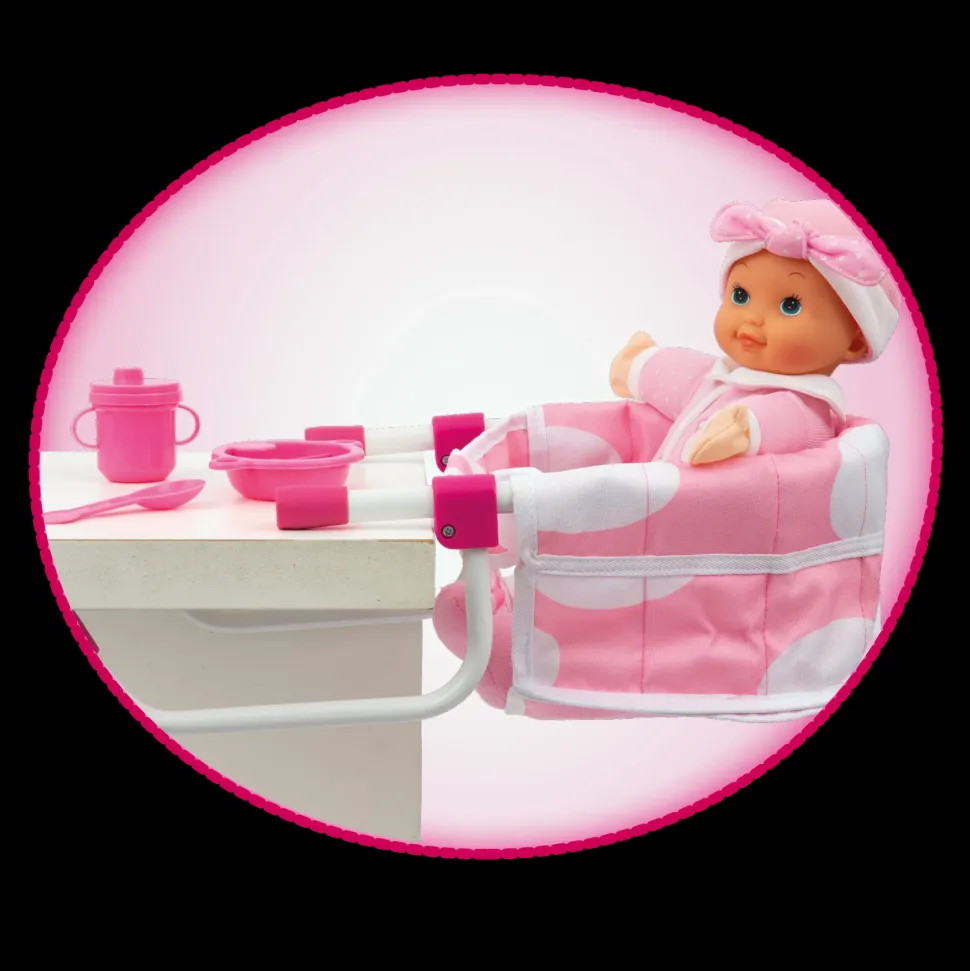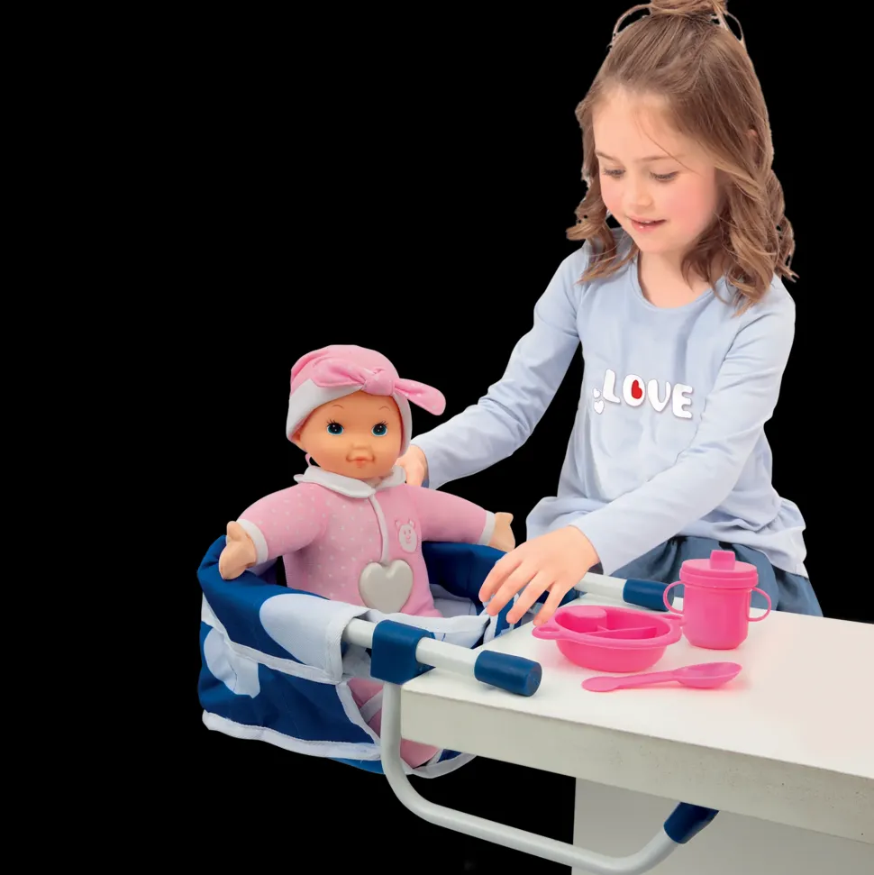 È Ora Della Pappa!Seggiolino Da Tavolo Con Struttura In Metallo Per Bambole.Include Set Pappa Composto Da Piattino, 2 Posate , 1 Tazza Per L’Acqua E 1 Ciuccio.Assortito In 2 Varianti Colore: Rosa E Blu.Bambola Non Inclusa.