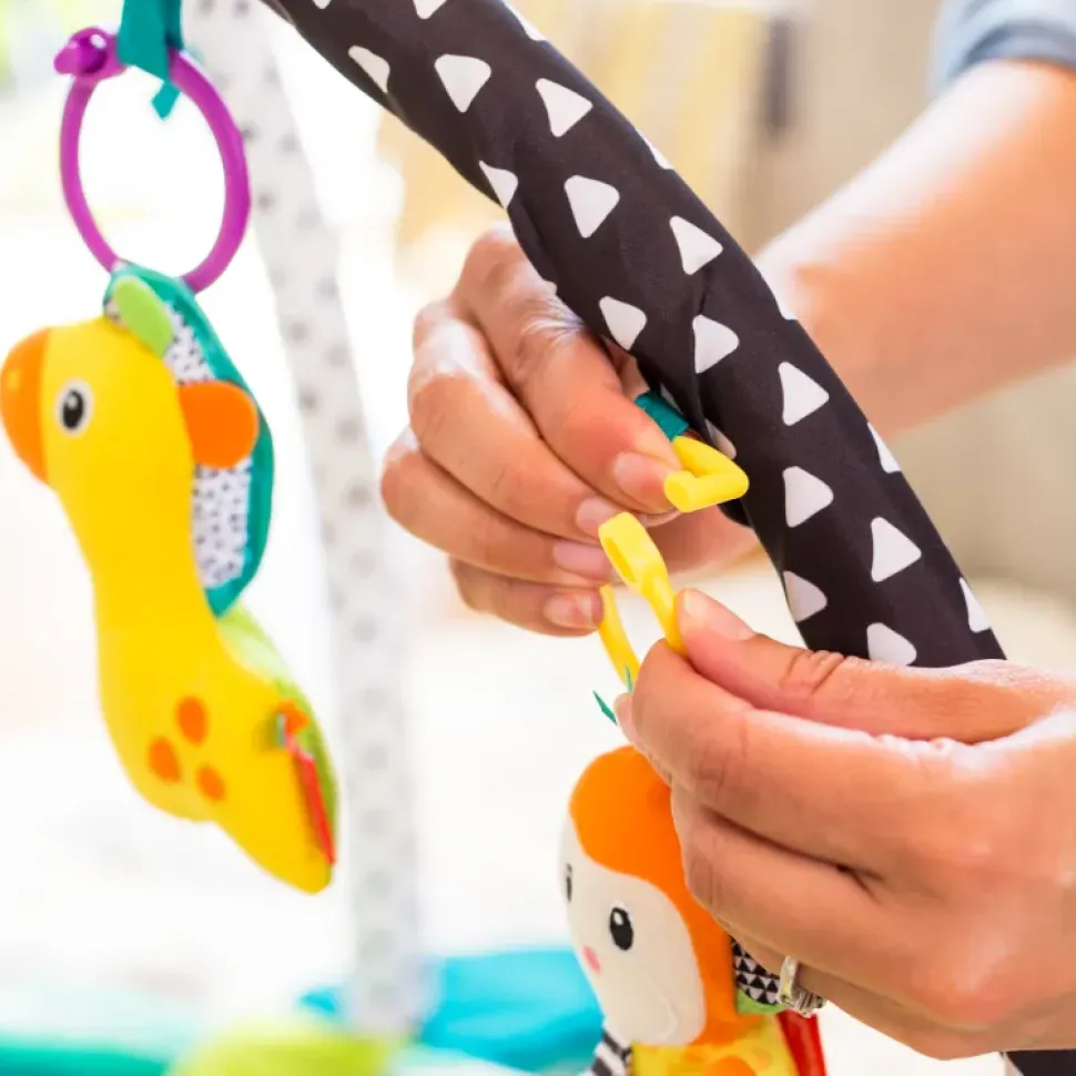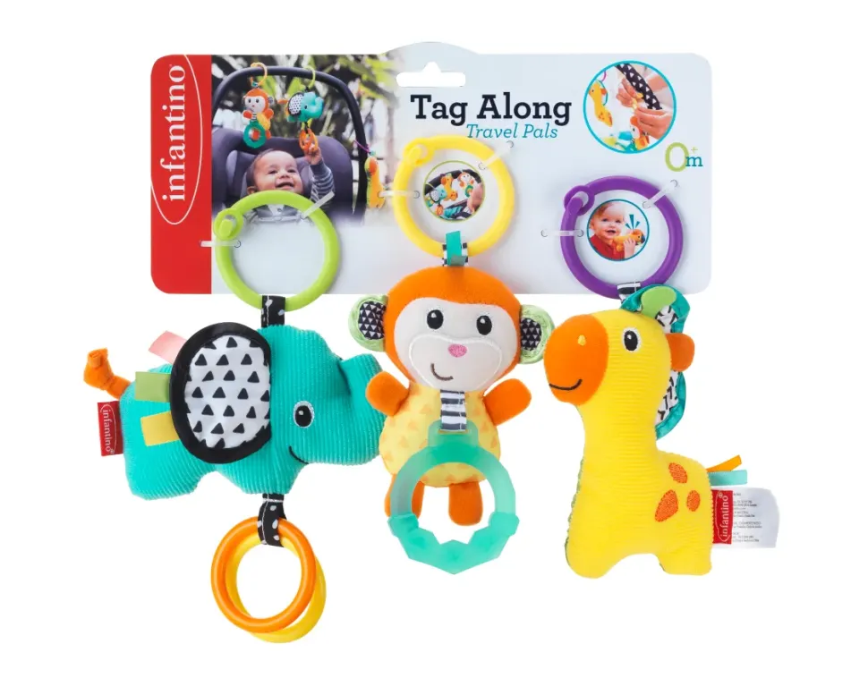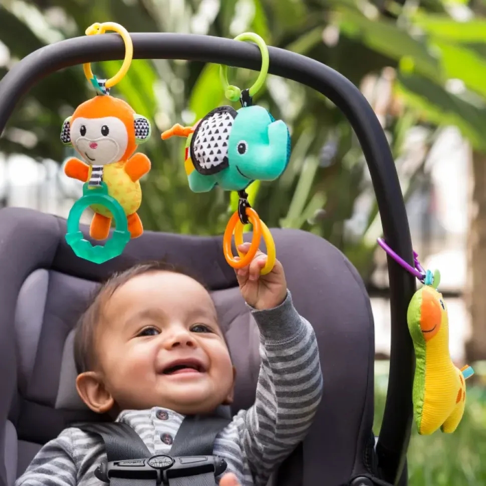 Ore Di Divertimento Garantite Con I Sonaglini Da Viaggio: L’Elefantino Con 2 Anelli Di Plastica Che Si Scontrano, La Scimmietta Con Il Suo Anello Da Dentizione Da Masticare E Infine La Giraffa. Tutti Questi Teneri Personaggi Sono Dotati Un Anello Di Plastica Sulla Testa Per Poterli Appendere Ovunque Senza Perderli.