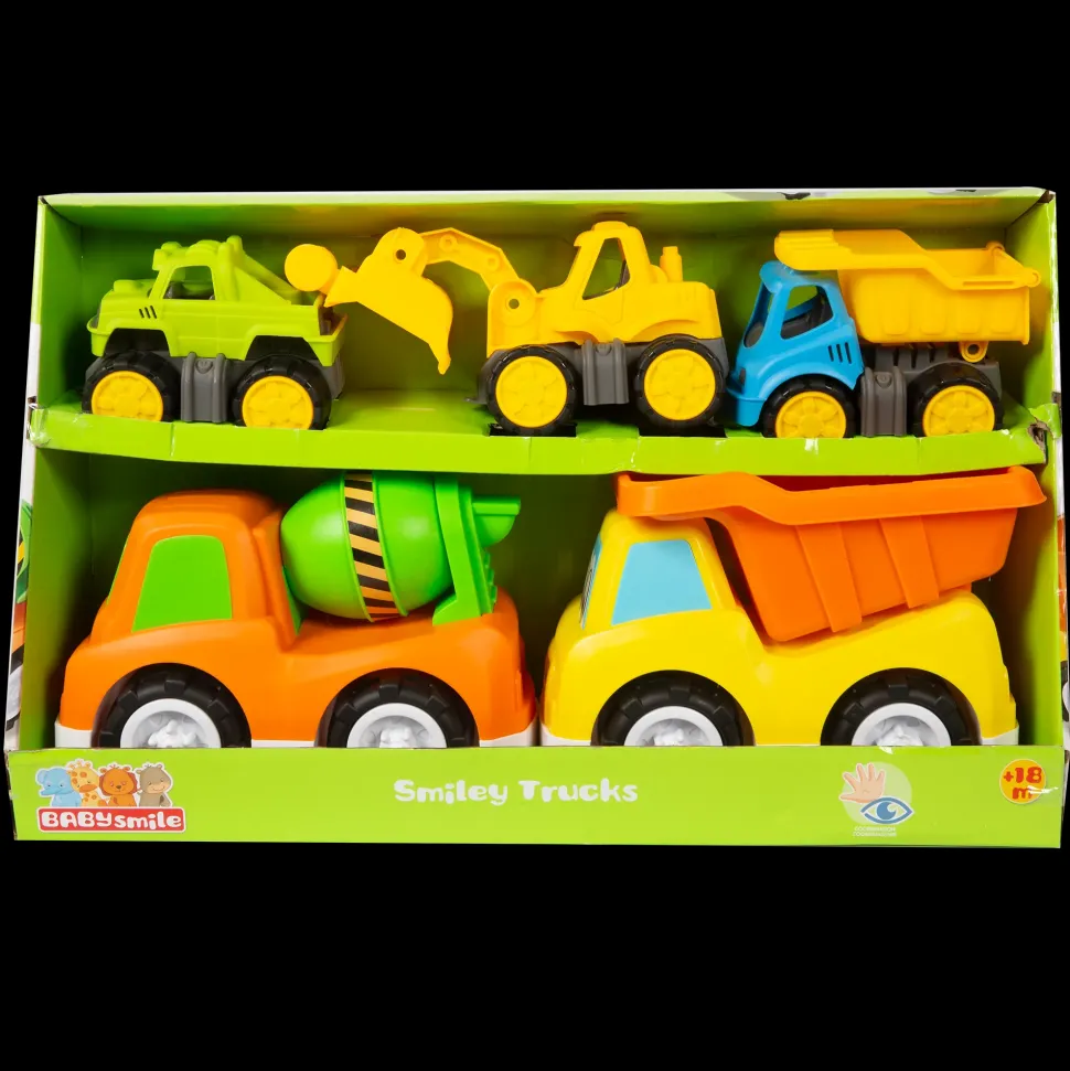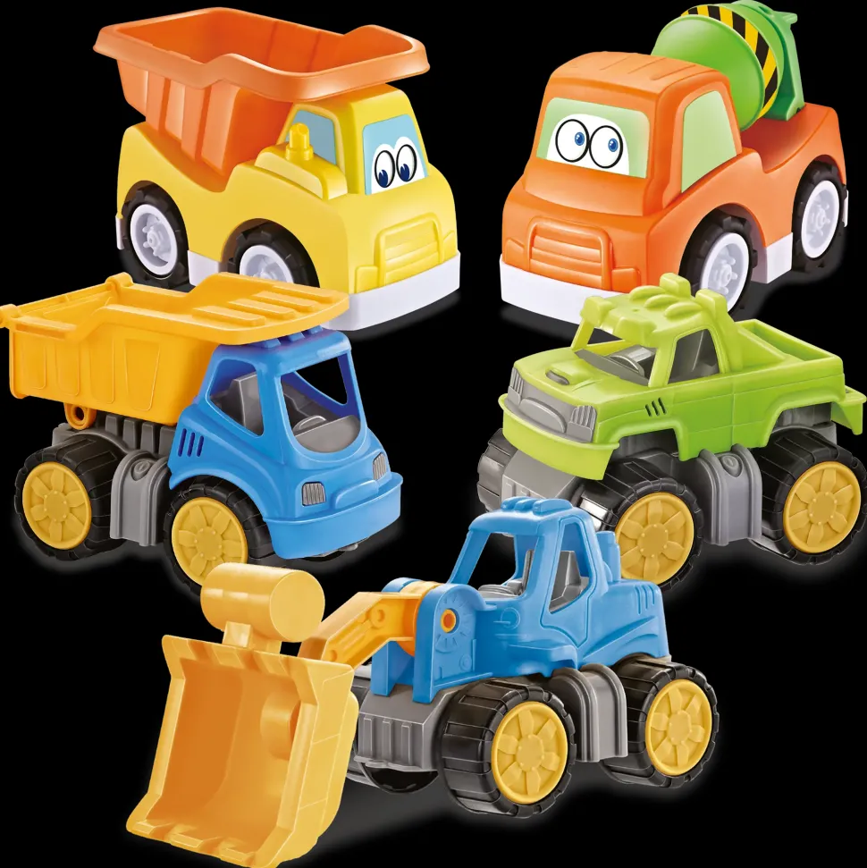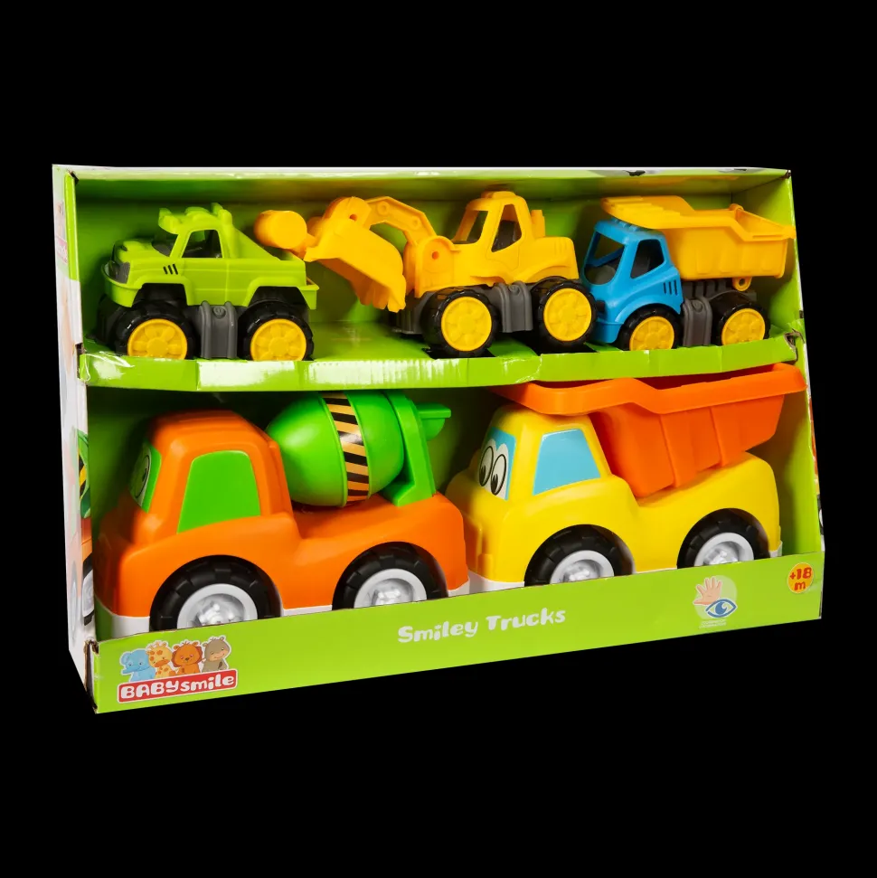 5 Simpaticissimi Veicoli Con Facce Buffe E Divertenti. 3 Veicoli Piccoli E 2 Più Grandi: Fuoristrada, Ruspa, Betoniera E 2 Camion Con Cassone Ribaltabile. Facendo Sfrecciare Questi Veicoli, Il Bambino Svilupperà La Motricità, La Creatività E L’Immaginazione.