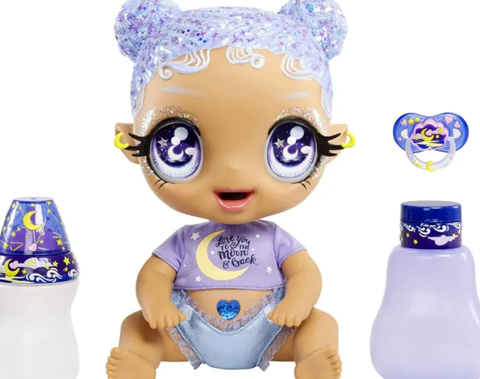 Mga’S Glitter Babyz Selena Stargazer Bambola Con 3 Cambi Di Colore, Capelli Viola Glitterati, Vestito Con Luna E Stelle, Accessori, Biberon E Ciuccio