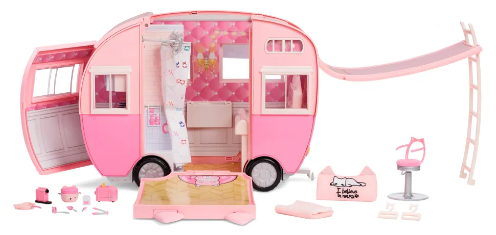 Na Na Na Surprise Kitty-Cat-Camper Rosa Con Orecchie E Coda Da Gatto 7 Aree Di Giochi Tra Cui Cucina Completa, Amaca E Accessori