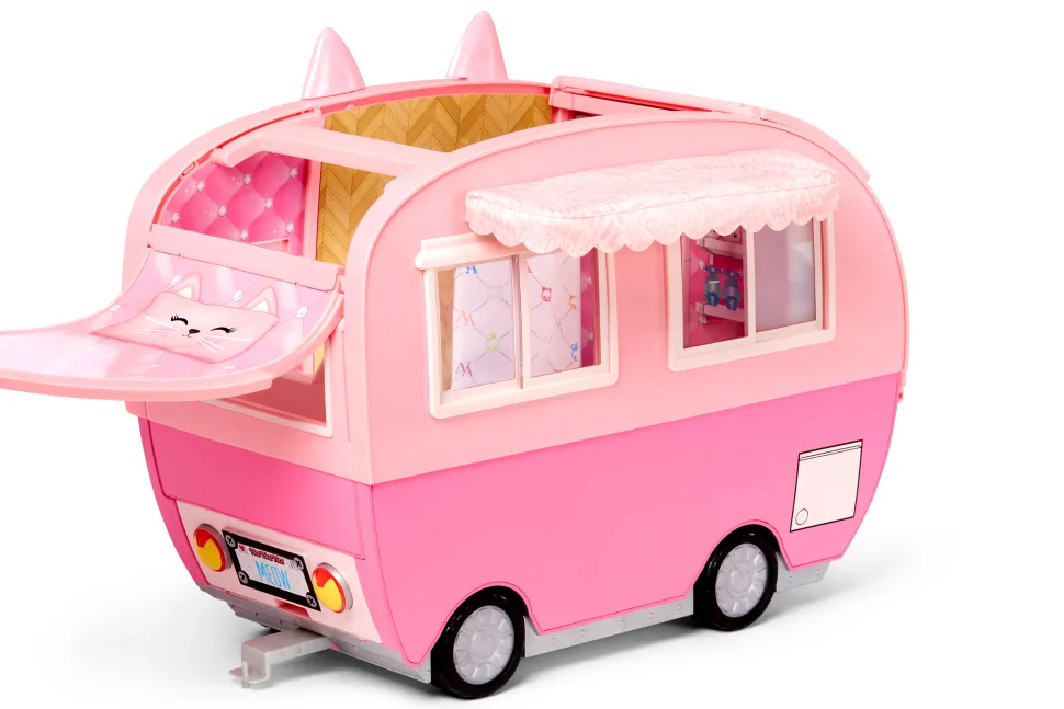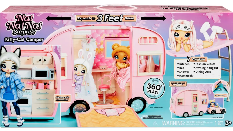 Il Camper Kitty-Cat È Come Un Grande Gatto Rosa Con Orecchie E Coda Di Gattino E Targa Meow. Ci Sono Molti Dettagli Stampati Ovunque Come Carta Da Parati Con Coniglietti E Piastrelle Con Animali. Solleva Il Pannello Superiore, Anteriore E Laterale Per Vedere Le Aree Di Gioco. Include Ruote Funzionanti, Finestre, Cassetti E Molti Accessori. Camper Con 7 Aree Di Gioco: Cucina, Letto, Doccia, Amaca, Armadio, Tenda Da Sole E Zona Pranzo. Si Adatta Sia Alle Bambole Na Na Na Surprise Che Alle Bambole Na Na Na Surprise Teens.