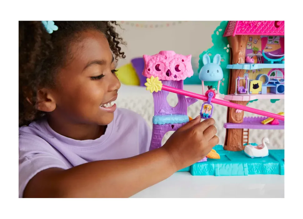 Il Playset Polly Pocket Pollyville Casa Sull’Albero Dei Cuccioli È Un Concentrato Di Divertimento E Attività Per I Cuccioli! Questo Playset È Il Top Delle Case Sugli Alberi! In Tutto Ha Cinque Piani Per Giocare E Puoi Espanderla In Modo Super Originale. Include Le Micro Bambole Polly E Shani, 4 Adorabili Animaletti, 9 Accessori Per Inventare Divertenti Feste Per I Cuccioli E 1 Veicolo A Forma Di Cigno. L’Azione Ha Inizio Non Appena Ti Metti Alla Guida Del Veicolo A Forma Di Cigno E Passi Sopra Il Dissuasore Di Velocità: In Questo Modo Farai Espandere Il Playset E Attiverai La Zipline; Continua A Guidare Passando Sopra Un Secondo Dissuasore E Rivela Uno Scivolo Con Cascata. I Bambini Possono Esplorare Le Sorprese E Gli Spazi Di Gioco Nascosti Suddivisi Su Cinque Piani E Accedere Ad Aree Come Lo Scivolo Di Emergenza Nascosto All’Interno Della Cuccia Per Cani, Il Punto Panoramico Sulla Cima Dell’Albero, L’Altalena Fatta A Cesta, Il Vano Segreto, L’Area Per Arrampicarsi, Quella Per Fare Un Giro In Mongolfiera E Molte Altre. Colori E Decorazioni Possono Variare. Un Regalo Fantastico Dai 4 Anni In Su.
